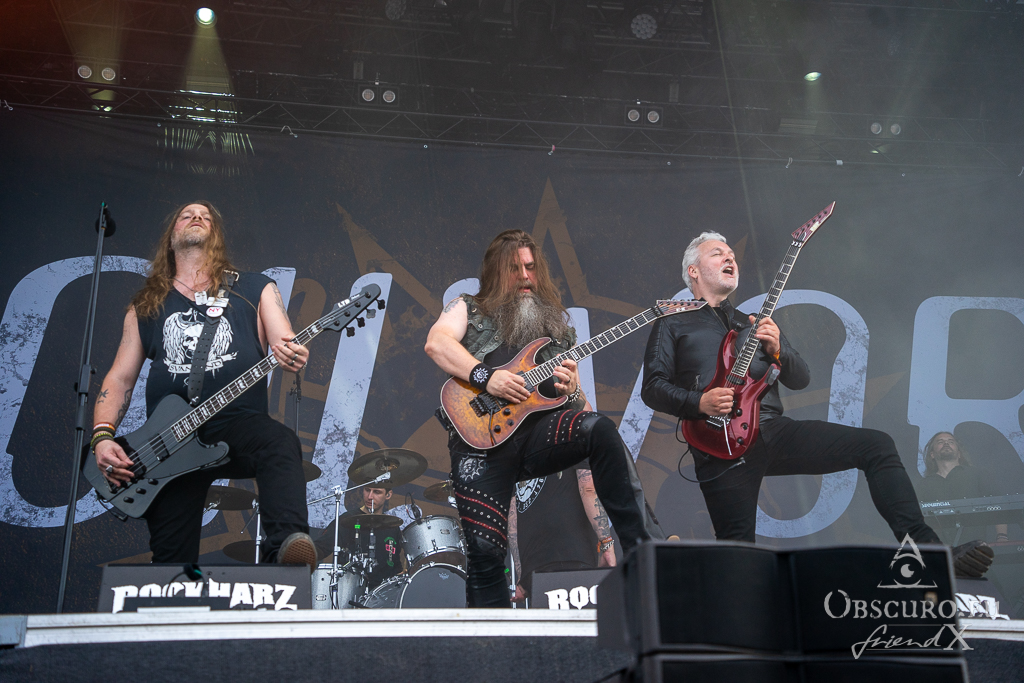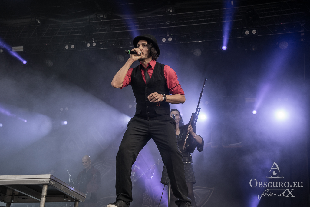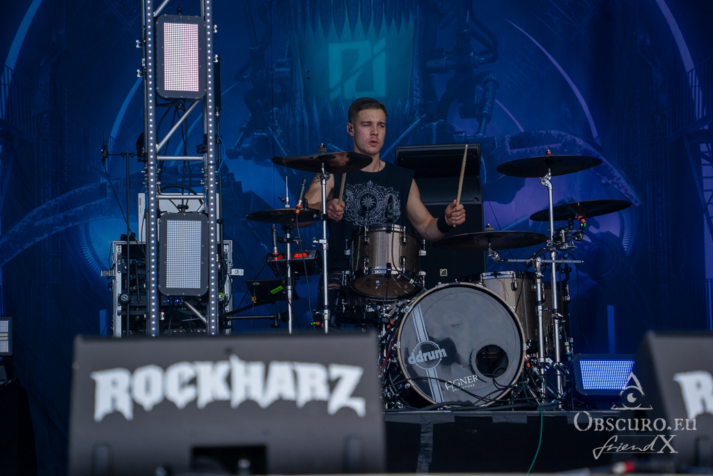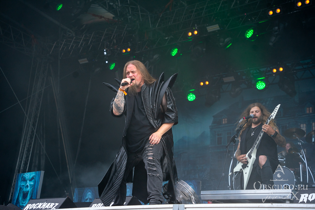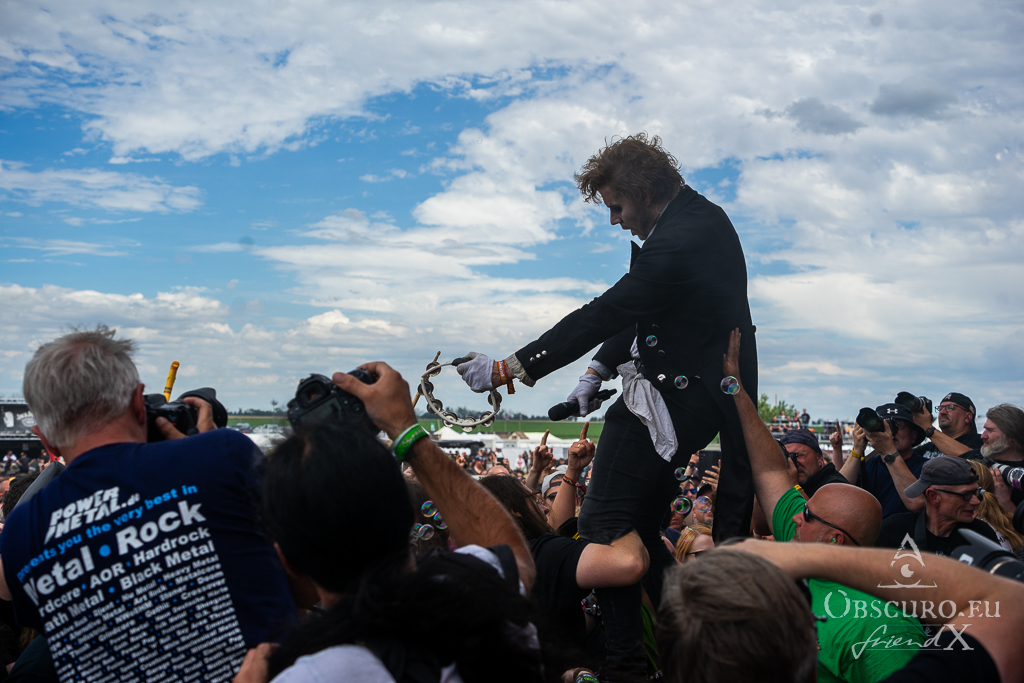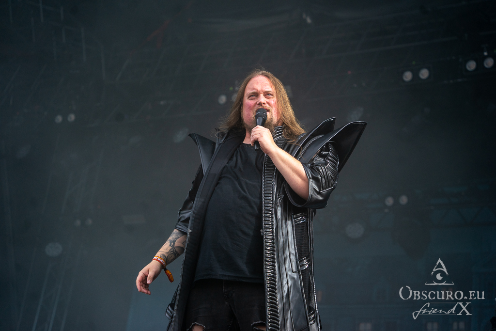 Thank all weather gods it doesn’t get as tough as feared. Rockharz is only slightly touched and can continue short before 18:00 as planned. Orden Ogan present songs of their brand-new album. They are not used to playing them live, so they ask the audience for support, or they might have to leave “when we fail”. Well, they don’t fail, and the new songs fit in perfectly.