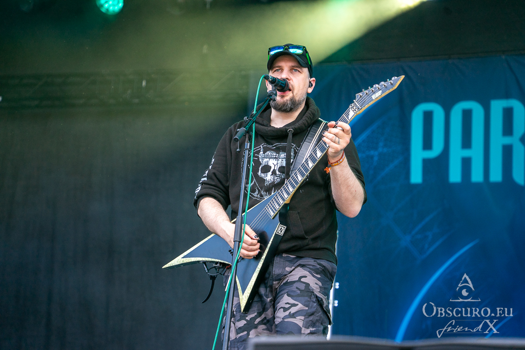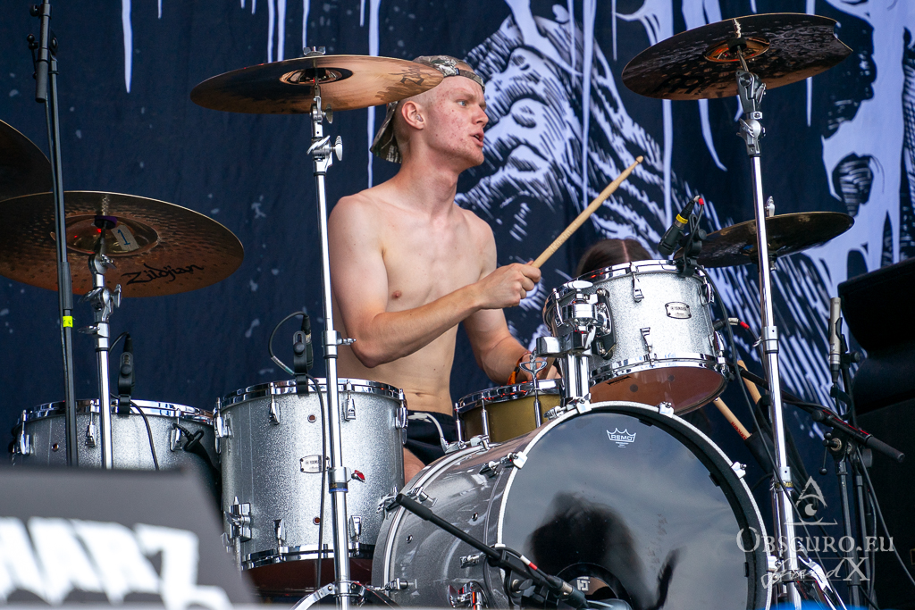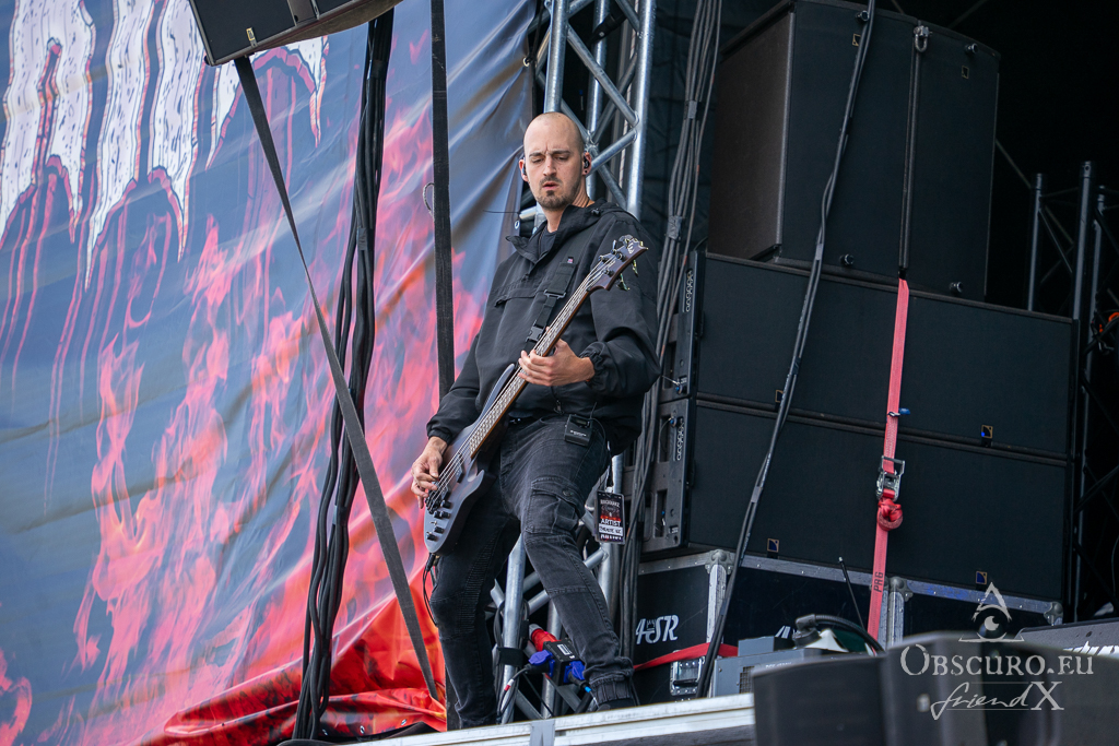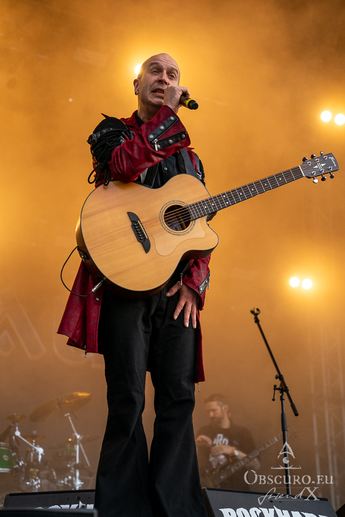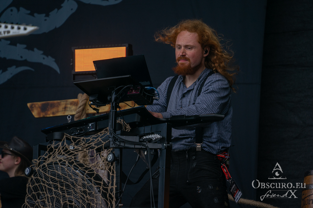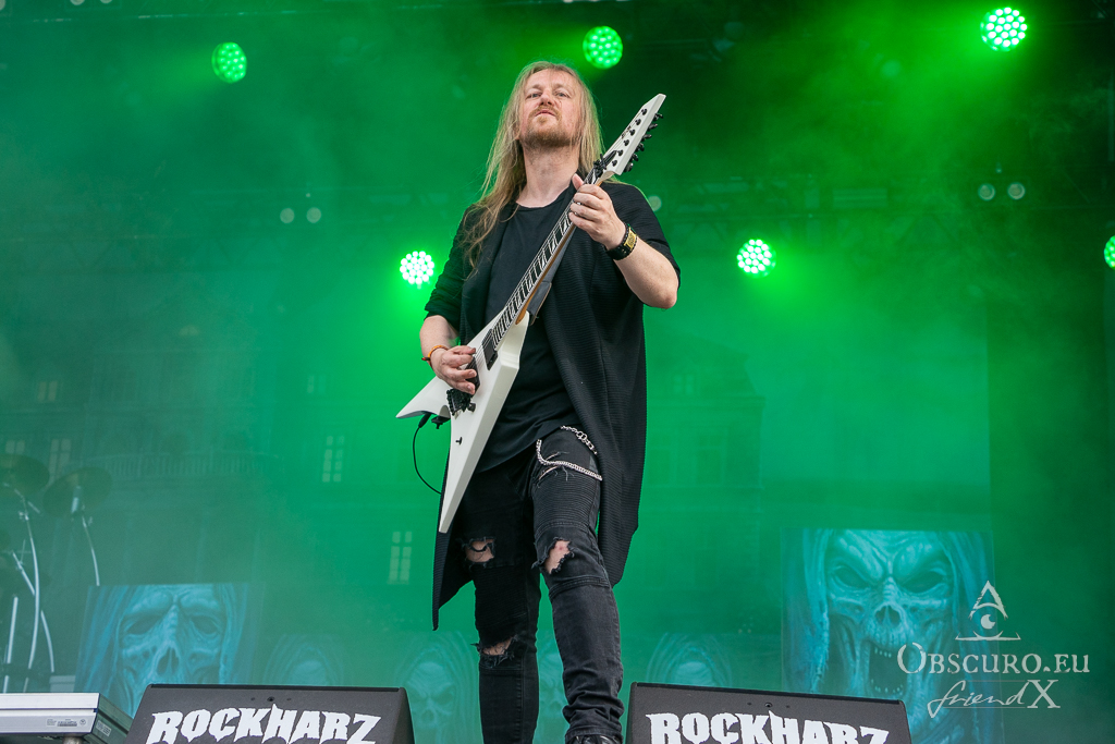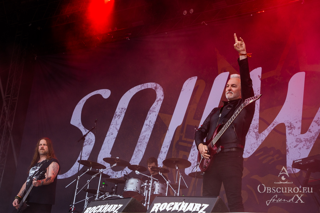 Thank all weather gods it doesn’t get as tough as feared. Rockharz is only slightly touched and can continue short before 18:00 as planned. Orden Ogan present songs of their brand-new album. They are not used to playing them live, so they ask the audience for support, or they might have to leave “when we fail”. Well, they don’t fail, and the new songs fit in perfectly.