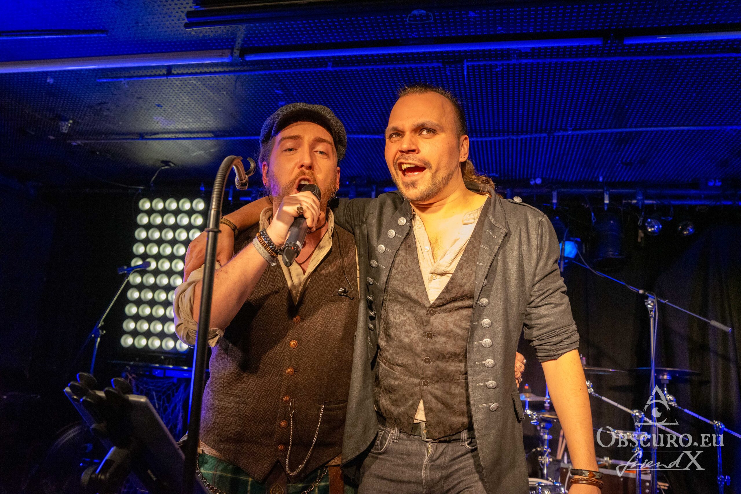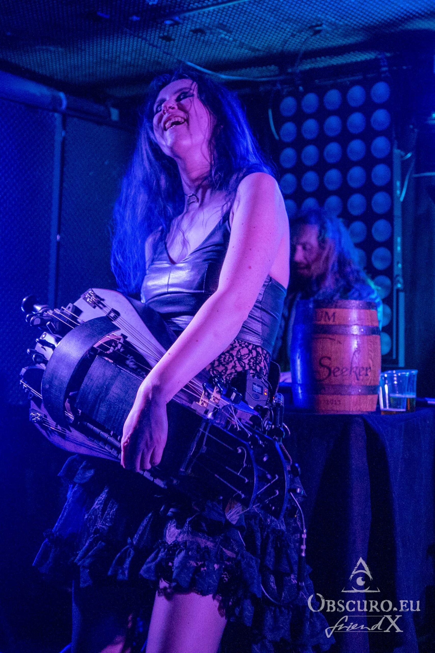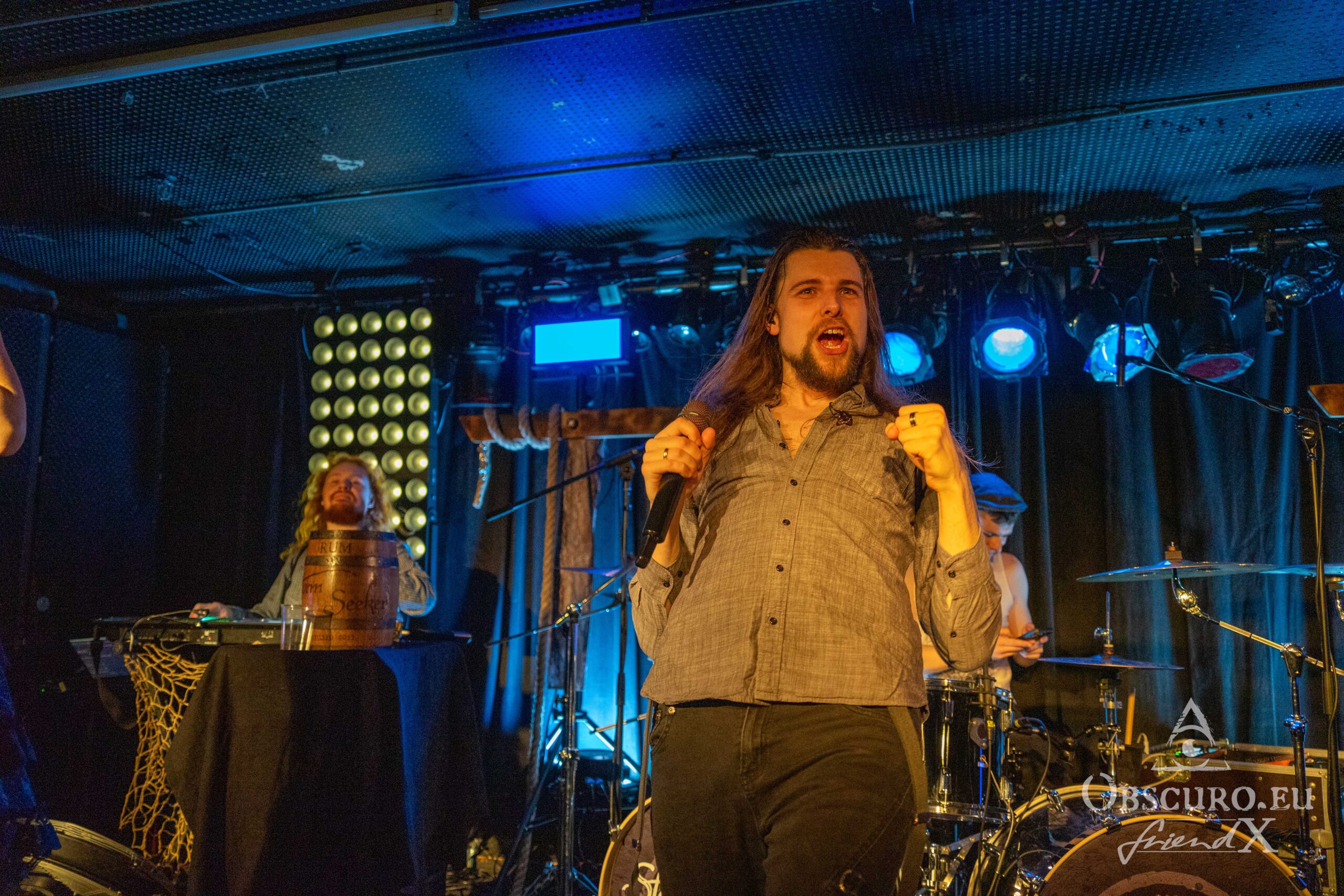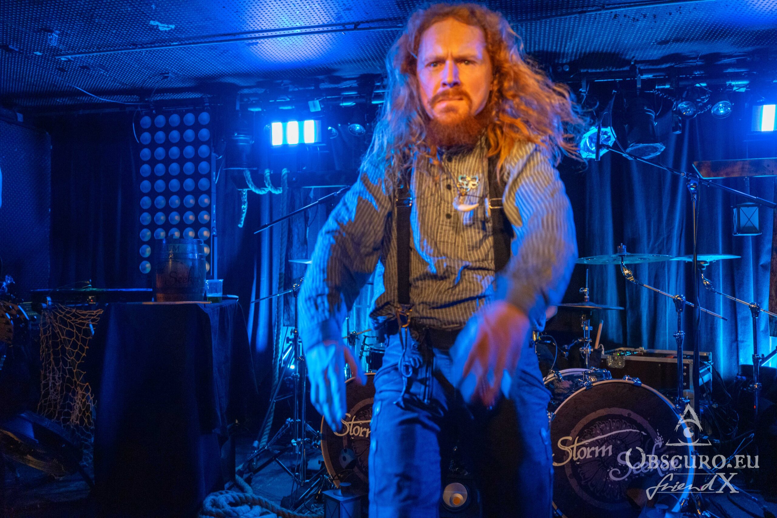 Then it is time for Captain “Timothy” Bornfleth on lead vocals and his crew, “Olaf” Bornfleth on percussion and drums, “Ughar der schrecklich Durstige” Braatz on beer barrel, keys and accordion, “Fabi” Kirschke on hurdy-gurdy and “Paulie” Martens on guitar. No bass player on board of their pirate ship, Well, a sixth and guest musician would have to fit into Storm Seeker’s brotherhood. AND he or she would need to squeeze in on stage. And this particular stage is smaller than most people’s bathroom…