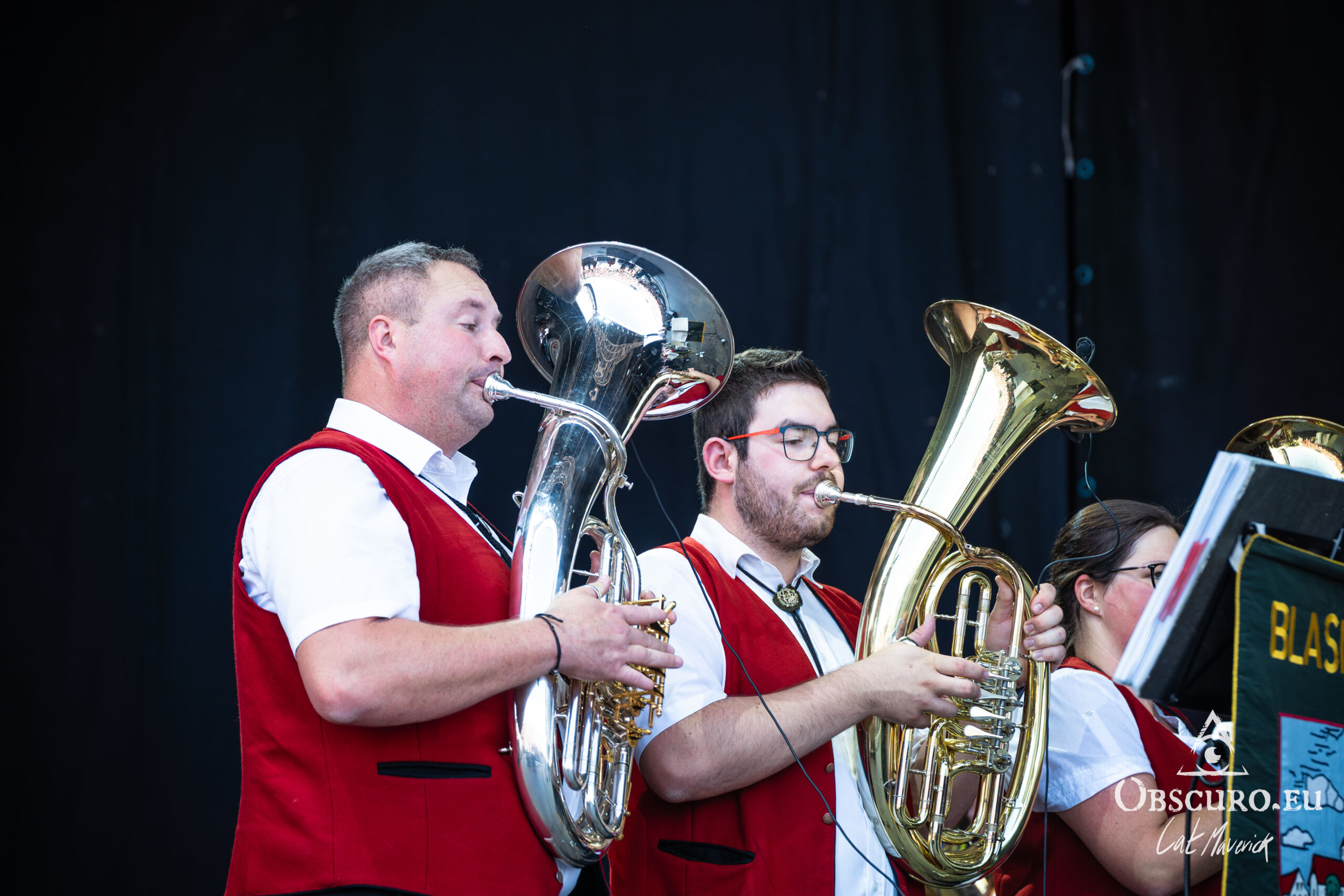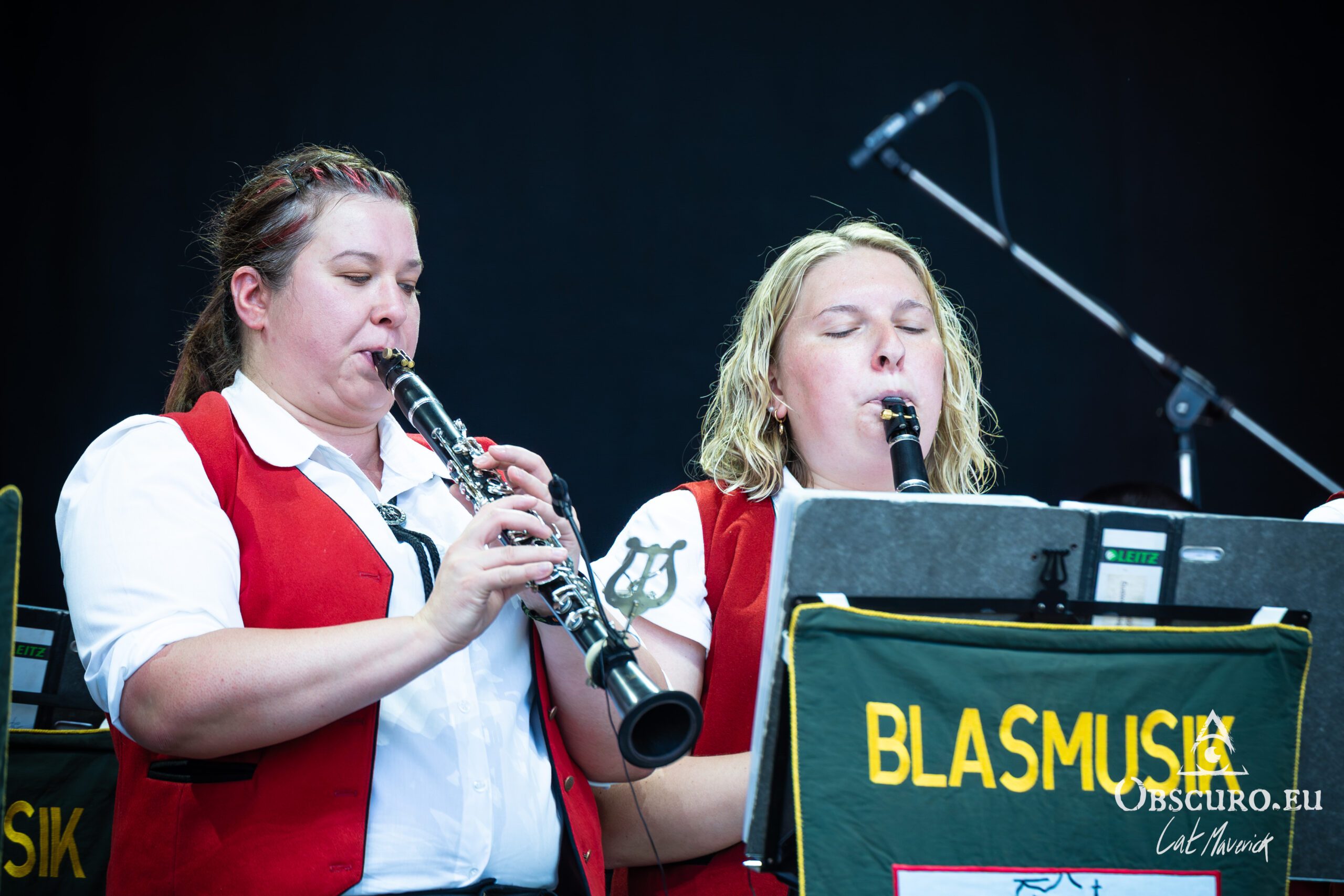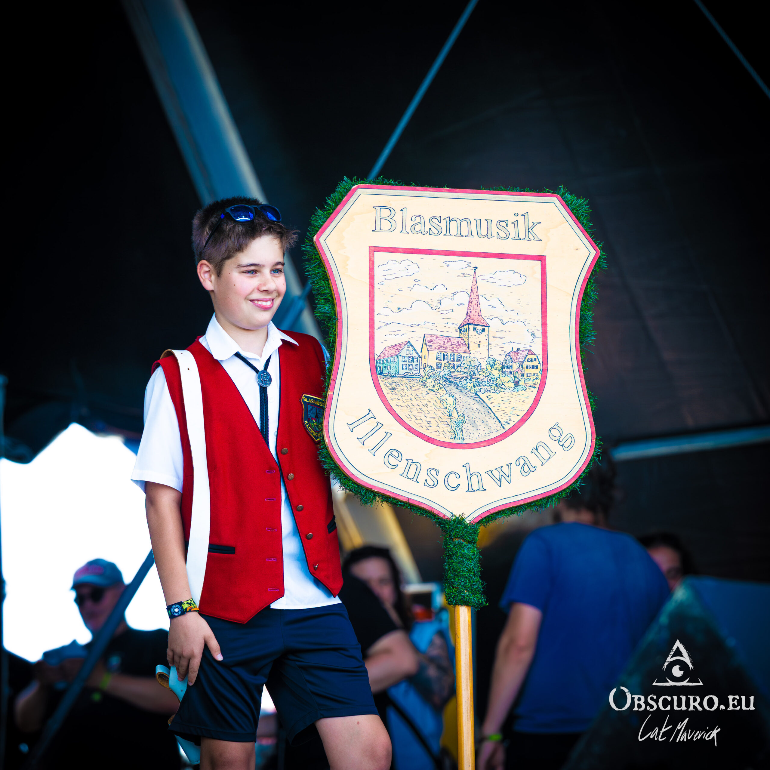The festival’s main program starts, and the honor of kicking things off as always falls to the Blasmusik Illenschwang. The traditional brass and woodwind ensemble, hailing from a nearby village, has become a quirky but beloved fixture of Summer Breeze, a delightful and openly welcomed anomaly in a sea of extreme sound.