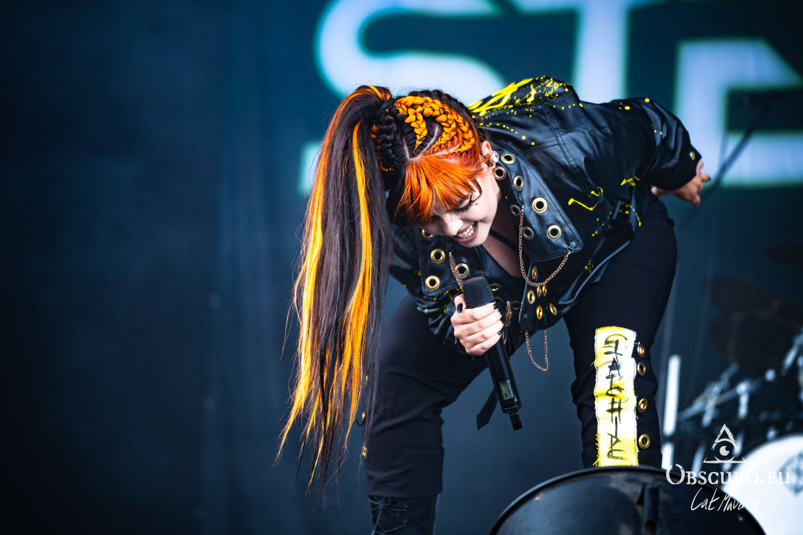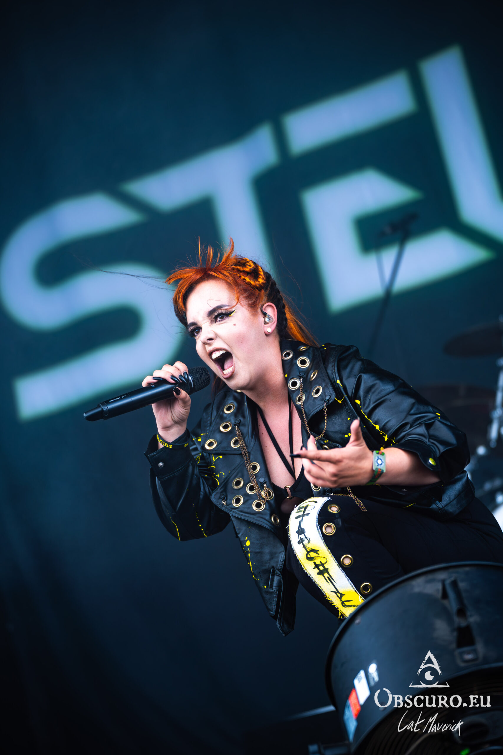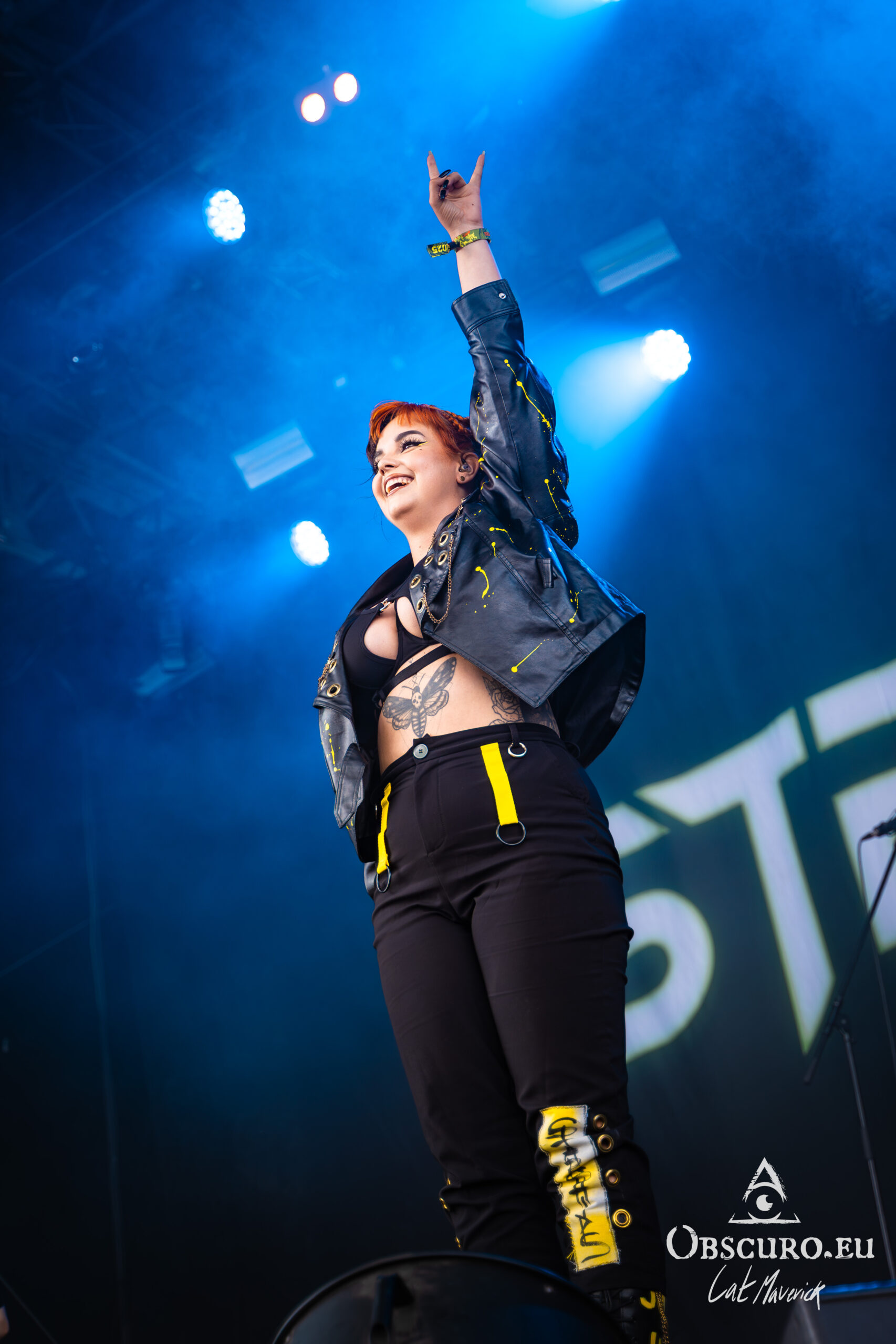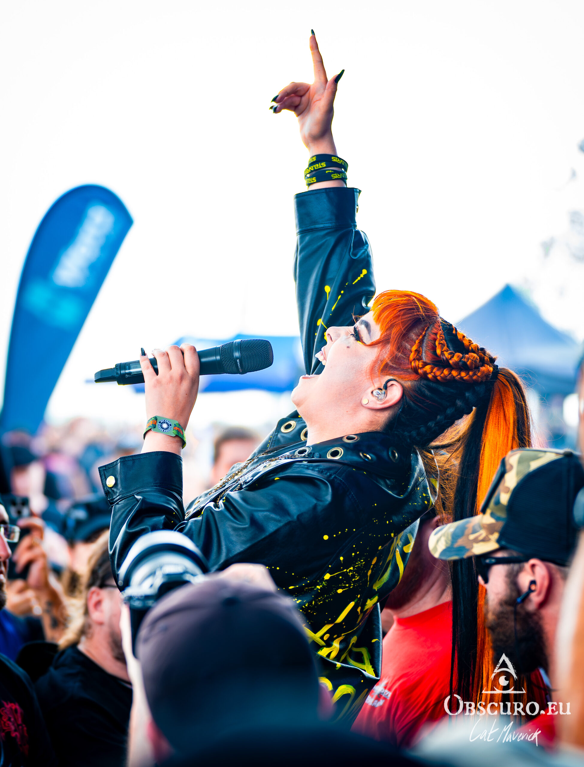 Next up is Stellvris, a band that radiates a fantastically positive energy from the moment they step on stage. Their black and yellow costumes, contrasting with the singer’s bright red hair, make for a striking visual. The frontwoman’s incredible crowd interaction is the highlight of the set. She excitedly jumps into a circle pit and commands a wall of death, creating an electric connection with the audience. The chemistry on stage is undeniable, and their powerful music, combined with their engaging performance, makes them a definite standout.
