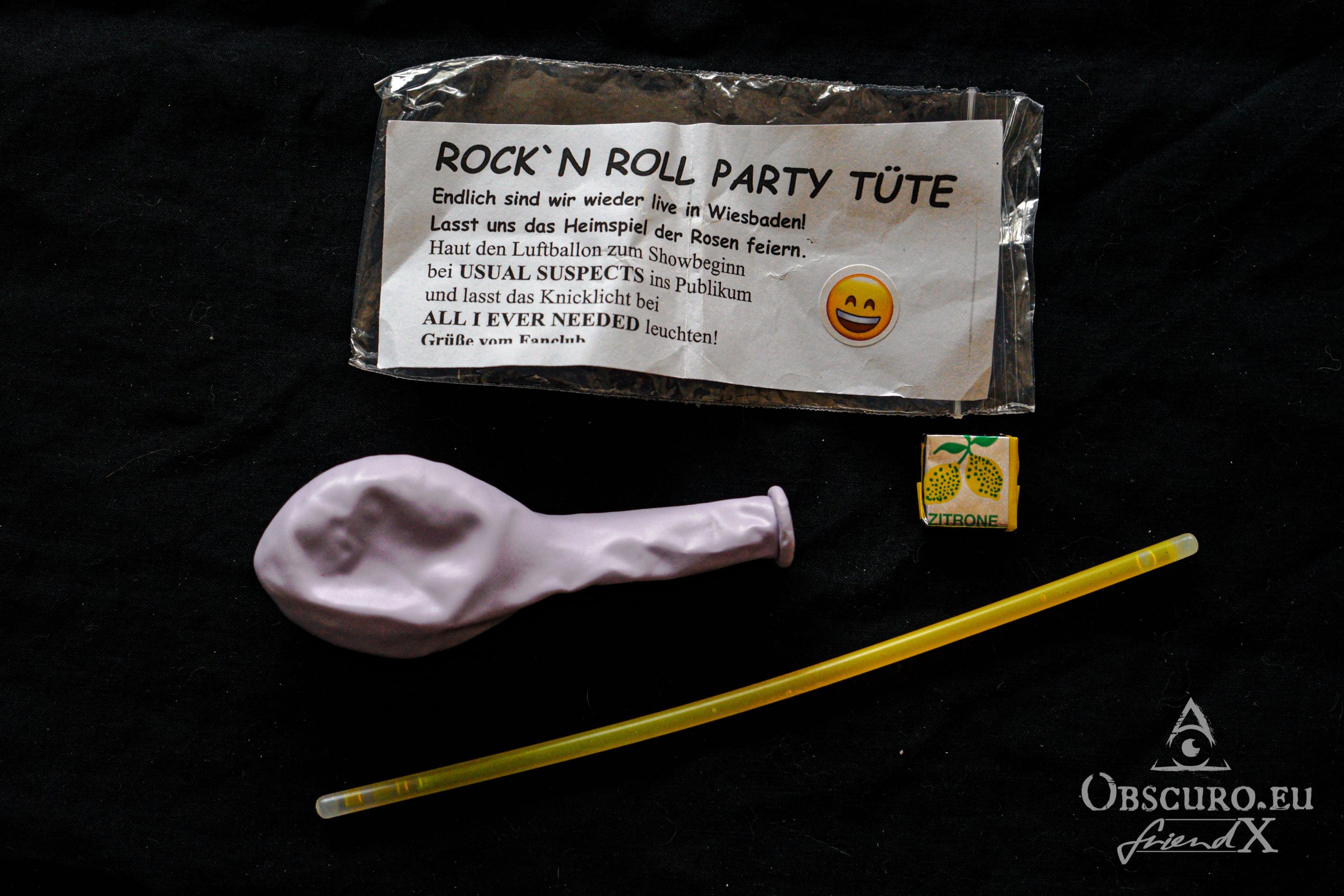 Arriving right in time I feel a bit like being in England, everybody is lining up in a queue. It is a quite long queue of several 100 meters. The doors have just opened. Once in, it is much warmer inside and I immediately regret wearing t-shirt, hoody, jacket and Kutte. The existence of a wardrobe is solving the problem so I can get rid of all the unnecessary clothes to pick them up again after the show. We all get a small plastic bag handed out. It contains a little light stick, a balloon, a chewy candy and an instruction what to do with it… I strut around, have a look at the merch stall and chat with the guy of the security who is in charge of the entrance to pit and backstage area.