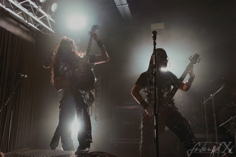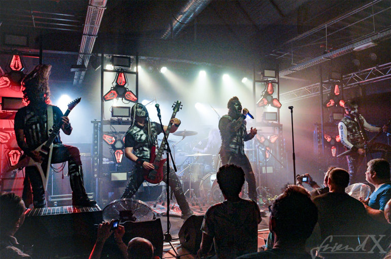 Then hall lights go out, fog wobbles over the stages, auspicious sounds catch your ear, stage lights flash. Dymytry from Czech Republic join the stage. The five musicians are all costumed in some medieval or apocalypse themed fantasy clothings and wear face masks. Their sound is fresh, heavy and catchy. They call it “Psy-Core”.
