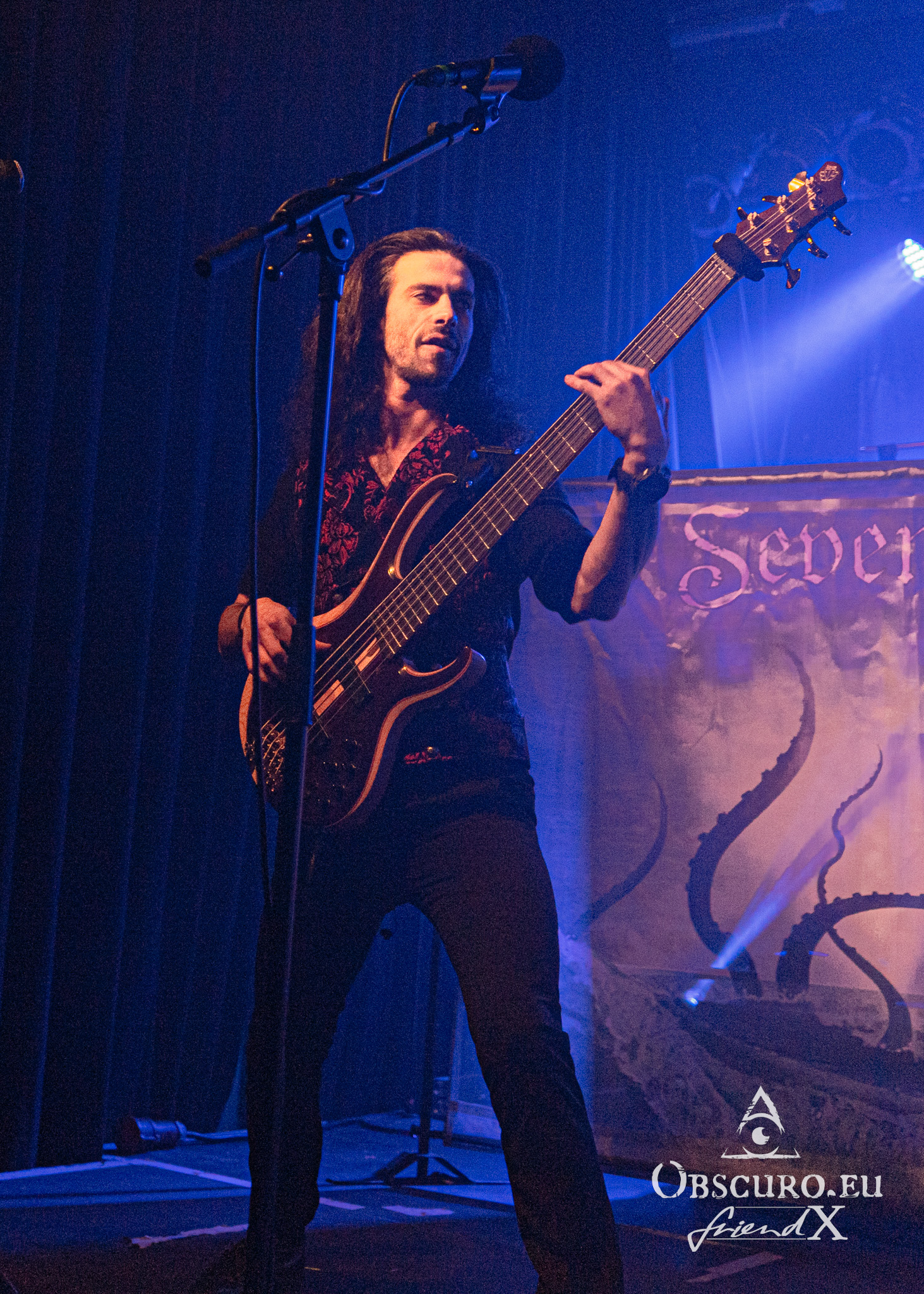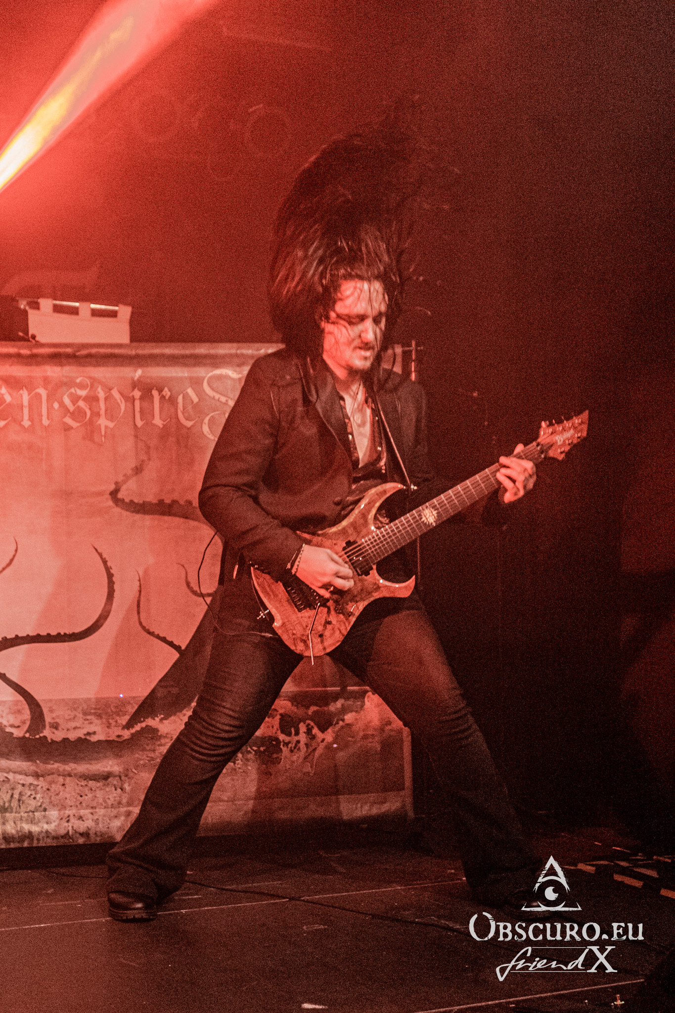 Nevertheless, the singer manages to stand out again. From screaming, to growling, clean vocals, high notes, and low notes – all within seconds are no problem at all for her. Some may know her from her work with Avastasia or Masters of Ceremony. Now she is touring Europe with her own Band Seven Spires. Her name of course is Adrienne Cowan. Jack Kosto – guitars, Peter de Reyna – bass and Chris Dovas – drums complete the band. Later the evening we will learn that it is a very special day today…
