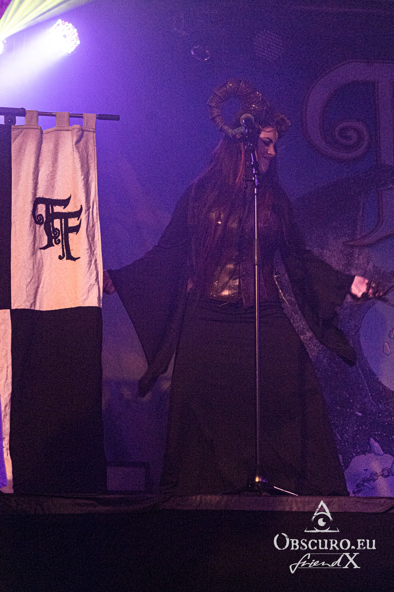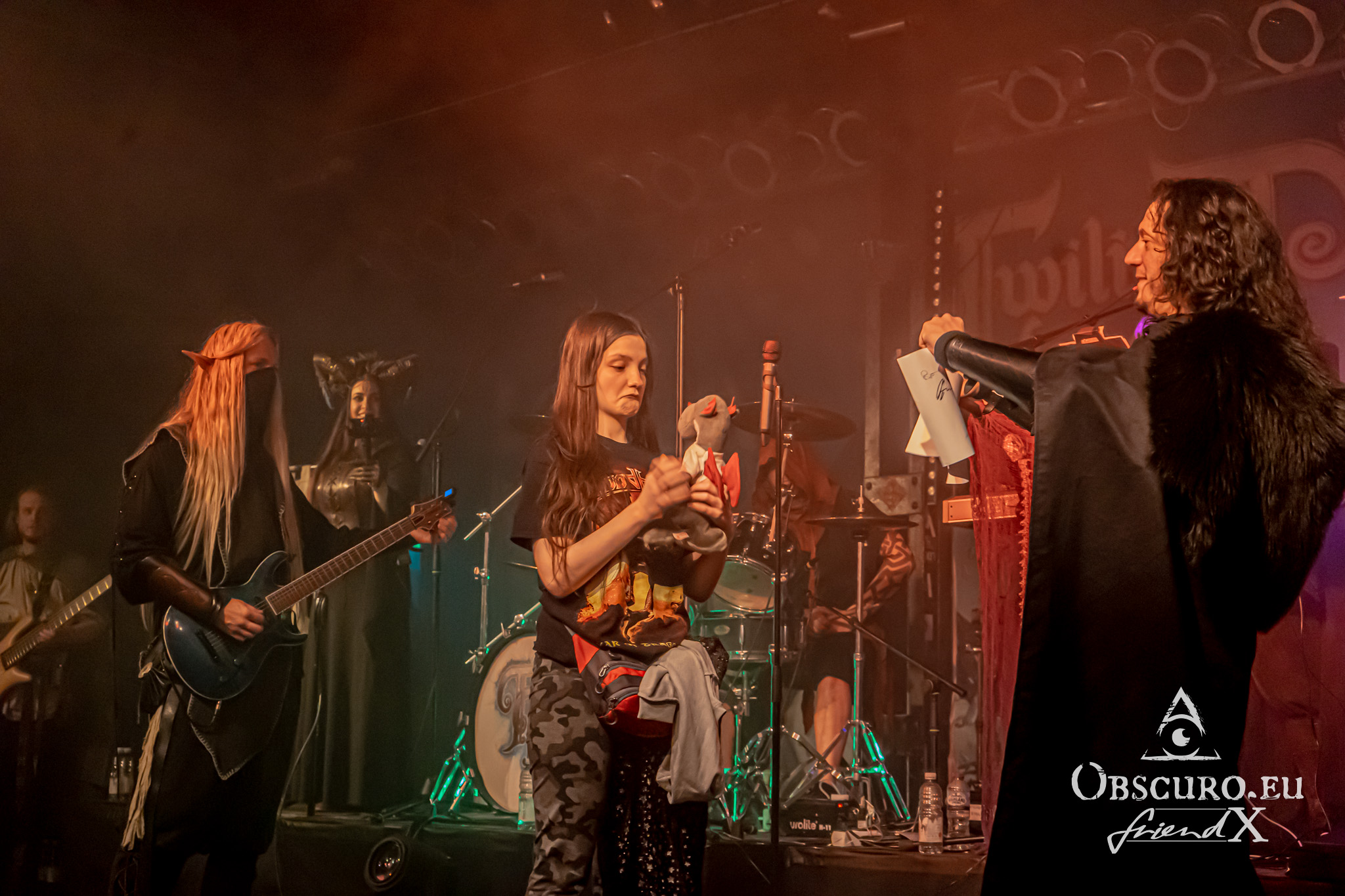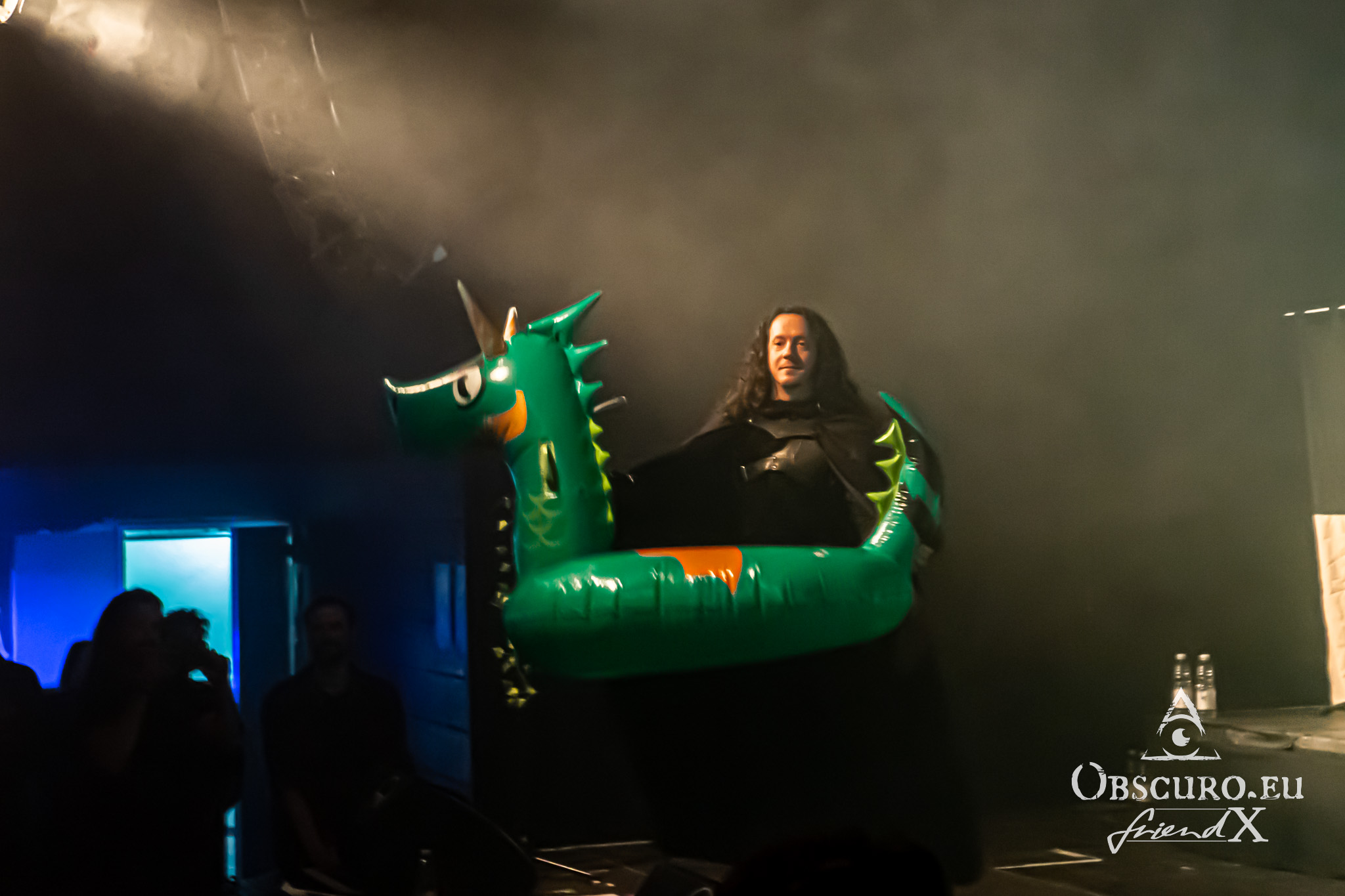 In between we see a rubber dragon flying around, it keeps the audience busy for one or two songs until it returns to the cave behind the stage. There is a chosen one from the audience, she is knighted live on stage by Allyon and receives her certificate under her tears of happiness. The jokes made by Blackwald are priceless. He looks and acts like a crazy wizard behind his keyboards.
