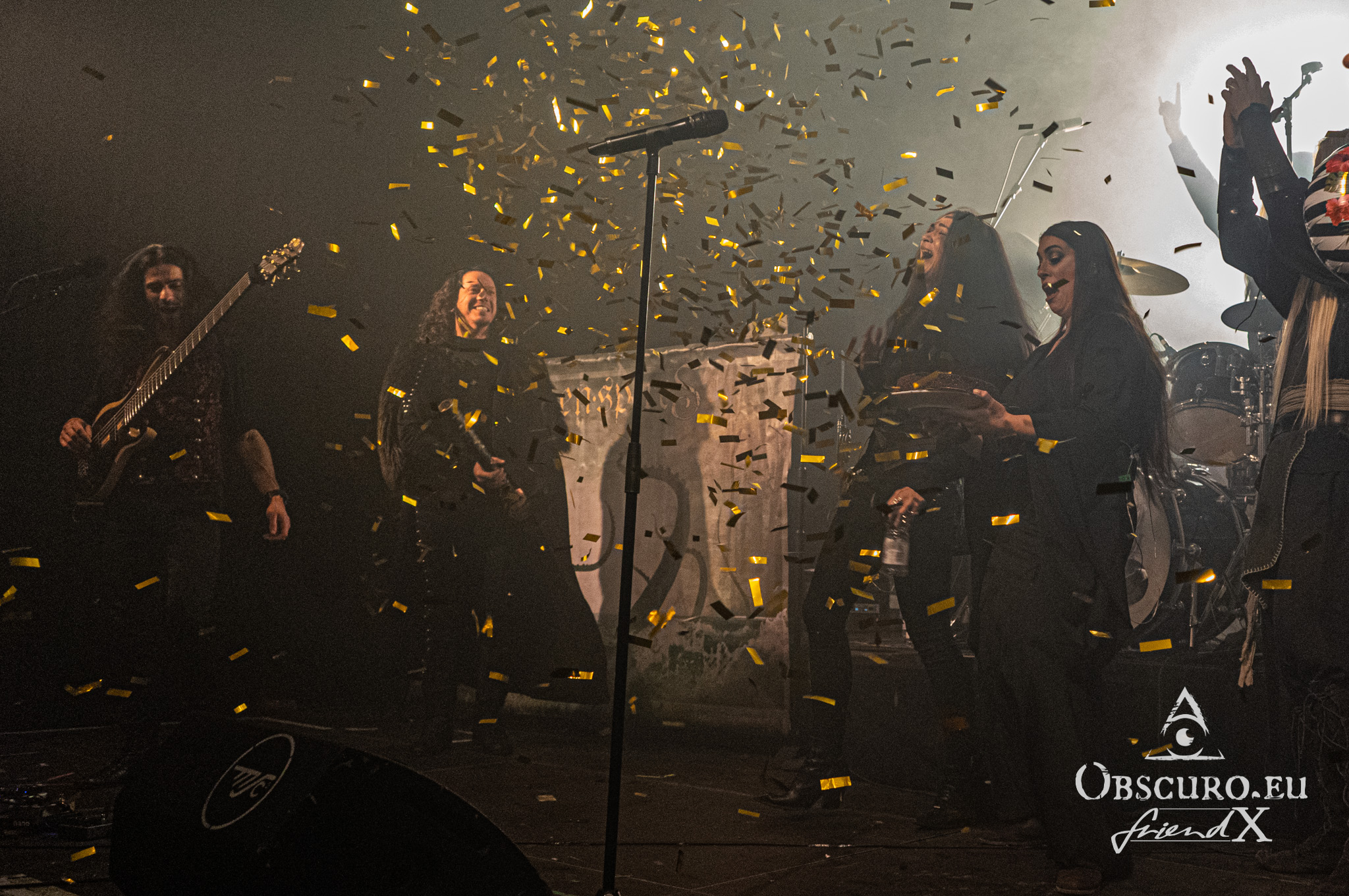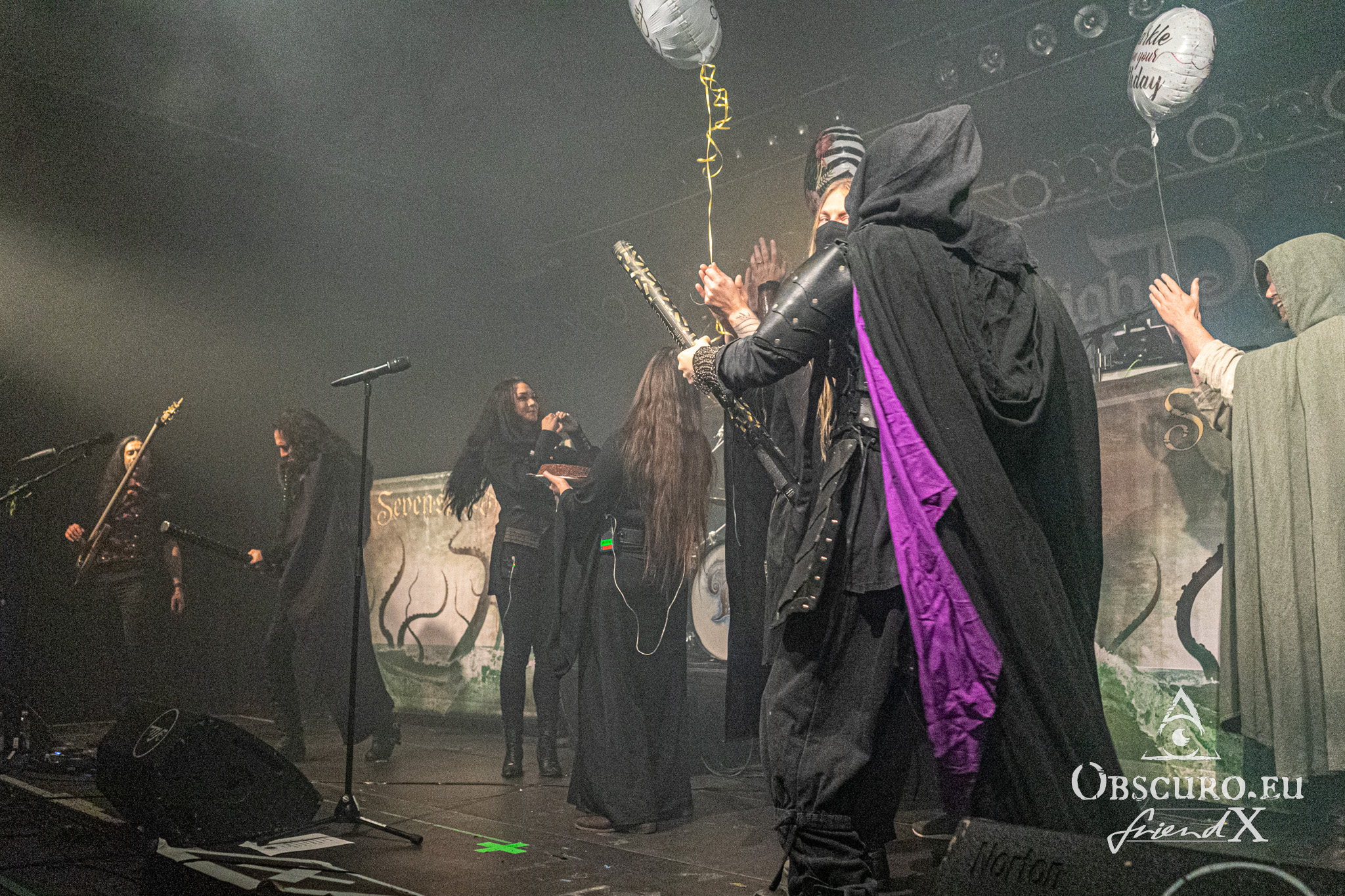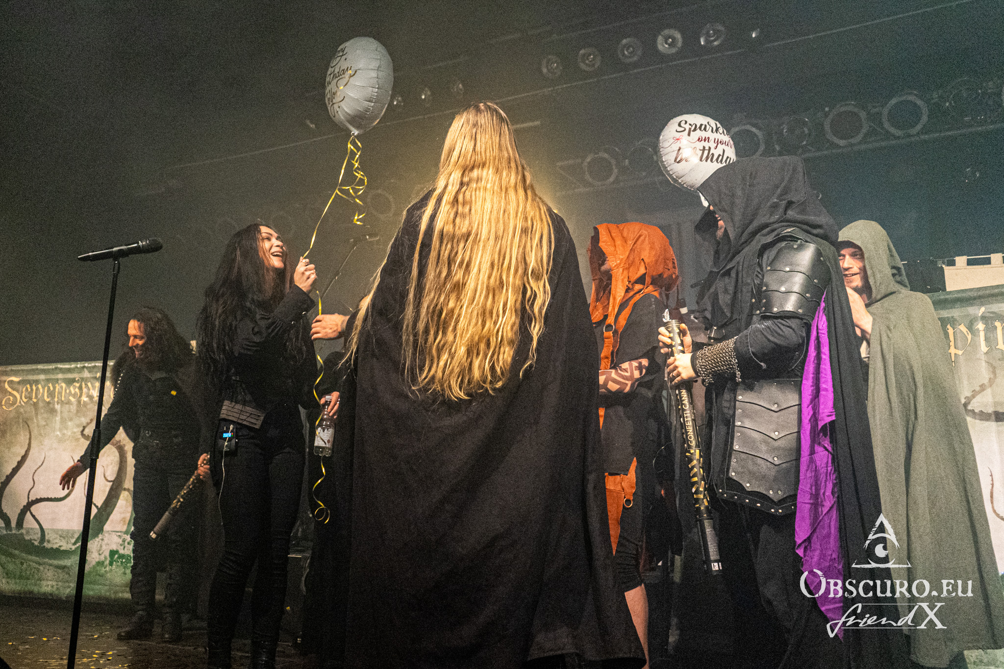 Suddenly there is an interruption. Twilight Force storm the stage. They hold balloons in their hands and throw glitter flitter all around it. Someone brings a cake. We are asked to sing a song for someone on stage instead of the other way round as usual. It’s someone’s birthday today and he or she is celebrating it with all of us. A thousand-voiced chorus sings Happy Birthday Dear Adrienne. Yes, it is her 28th birthday. There certainly are worse ways of having a birthday party than being on your own metal show.