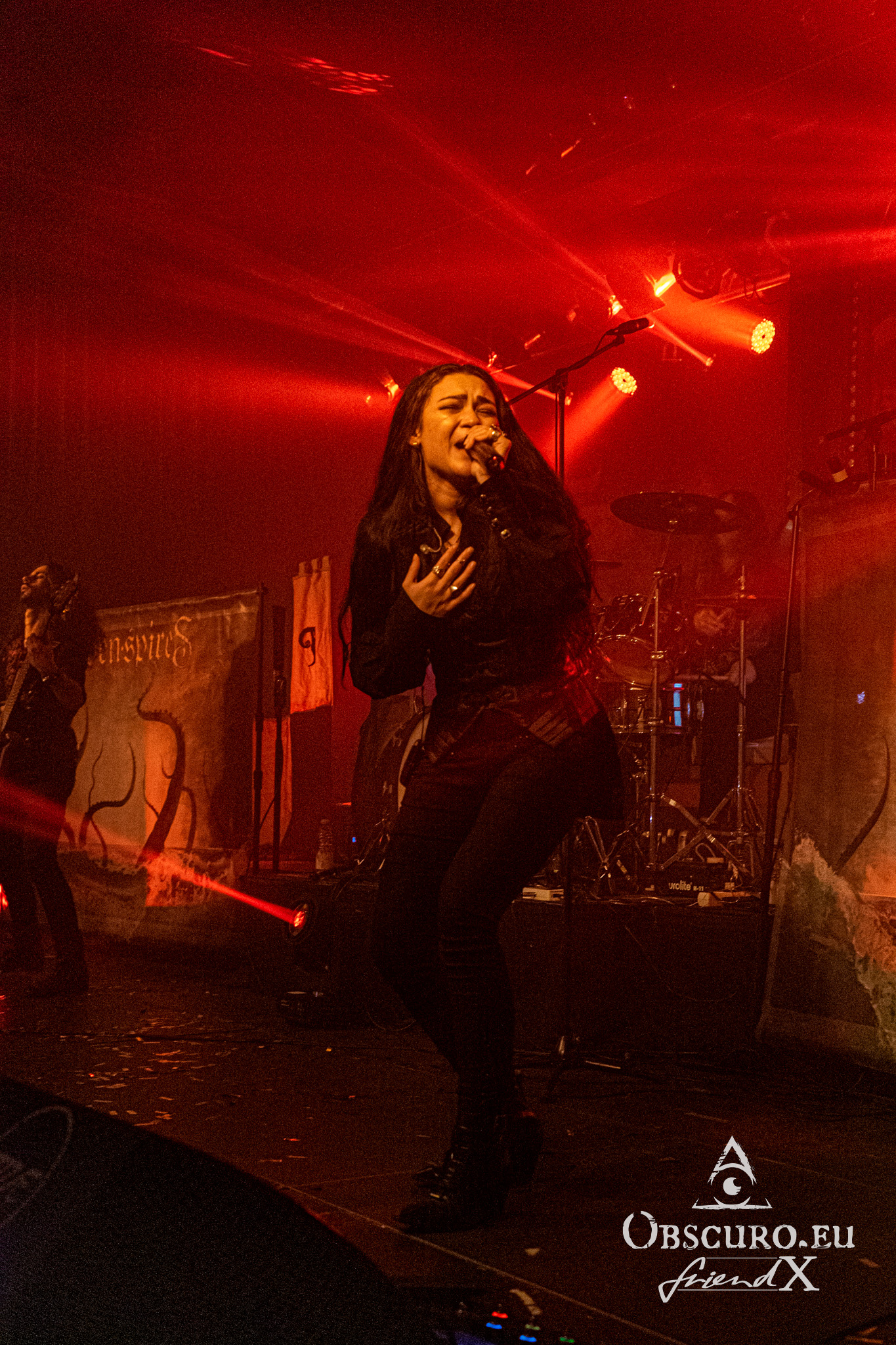 One after another they enter the stage, drummer, bass player, guitarist and finally after the short intro the vocalist. What a blast they are! Seven Spires rule the stage from the beginning. It is a pure pleasure to experience them performing! It is a pure disaster how badly their sound is mixed. Adrienne might even have sung without a microphone. Many bands would have given up and listlessly reeled off their songs. Not Seven Spires, instead it seems to motivate them to play more accurately to even it out.