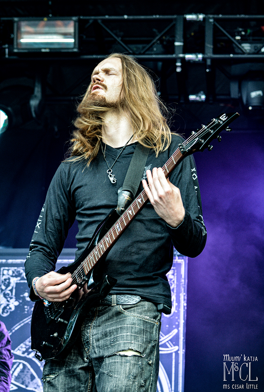 So I wonder: “Is there another bass player you like in particular for his way to play, giving you ideas how to play things?” “Well? I do but, I don’t know, but I’m not copying”, he replies. Vesa suggests another vocabulary: “imitate …” But I meant it in another way: No, I did not think of copying but … inspiring.” So the bassist names his favourite inspirations: “Well there are some as Alex Webster from Cannibal Corpse, I would like to be as fast as he is. Then there are some like Lauri Porra from Stratovarius, he is that kind of guy who wants to go out from the playing the same parts as guitar. Especially when he plays live there are like middle solos everywhere.” Vesa also has a name on the list: “Also Sami Hinkka from Ensiferum.” – “That’s ridiculous how much he plays”, explains Vesa.